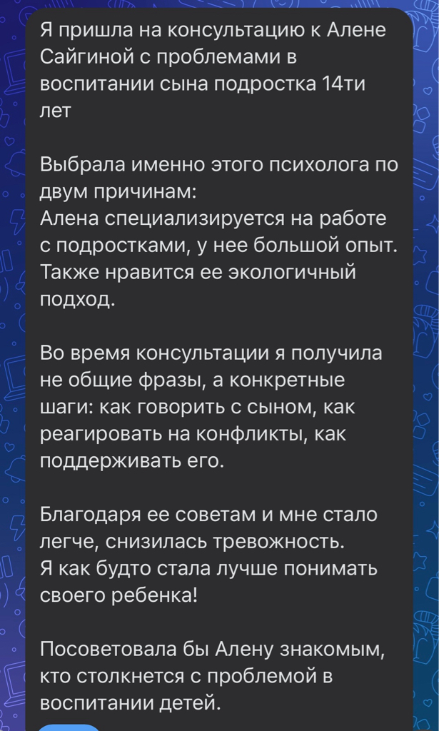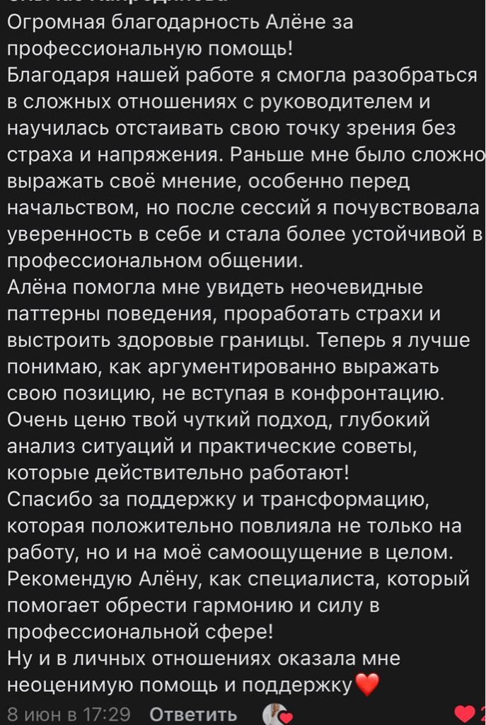 Вы можете рассчитывать на меня как на надежного специалиста, готового поддержать вас в сложных жизненных ситуациях и оказать квалифицированную помощь в восстановлении внутреннего баланса и эмоционального благополучия.