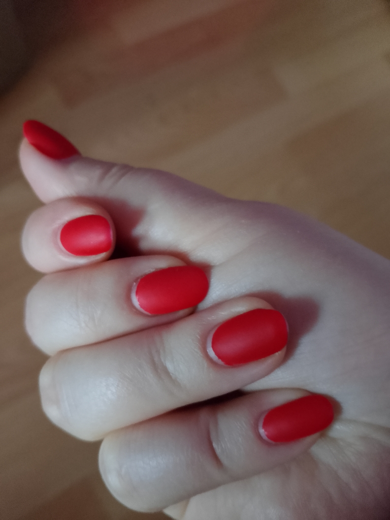 Достаточной выбор палитры цветов, в этот раз решили красный, матовый. Я очень давольна результатом. Фото после двух слишнем недель. Рабочее место содержится в чистоте. Инструменты вскрываются и крафпакета. Шкаф для обработки инструментов есть. Хожу с весны, нареканий нет к мастеру.