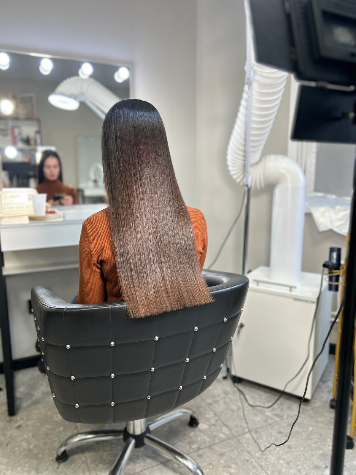 Студия уютная, стильная, хорошая защитная маска, чай с конфетами и конечно же в итоге гладкие, ухоженные, блестящие волосы 💇♀️🥰