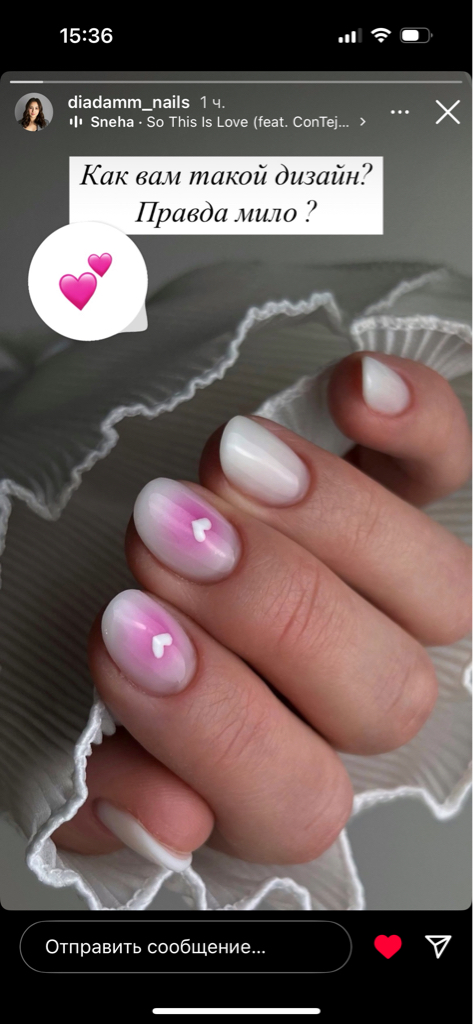 Диана- лучший мастер!!! По моему скромному мнению 😁 Обожаю! Уже какой месяц хожу к Диане и каждый раз радуюсь! Люблю всем сердцем ! Доверяю только ей свои ногти, всегда приятная атмосфера в студии, комфорт