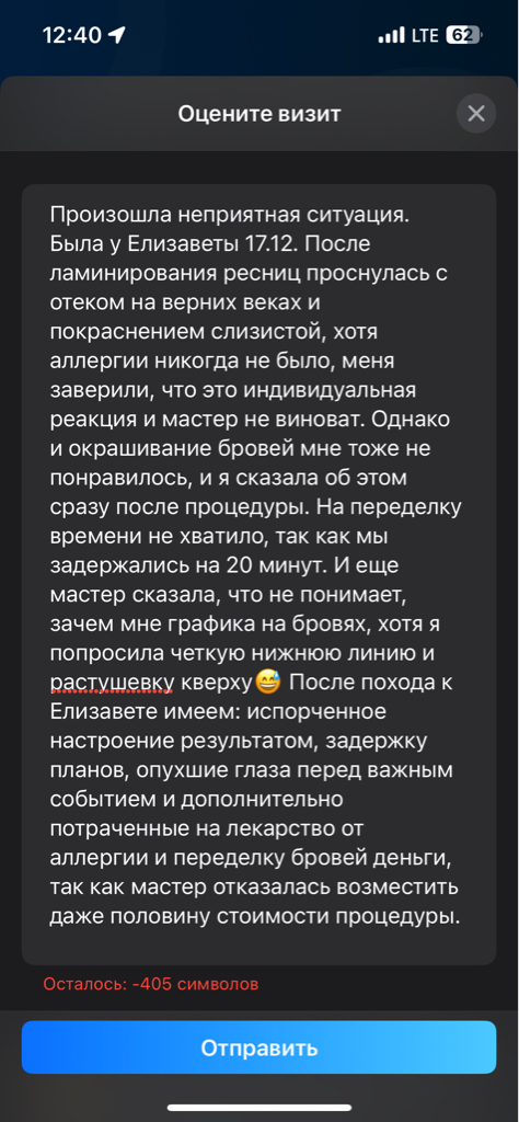 Доброго времени суток всем,хотела бы поделиться приятным впечатлением о работе Лизочки. Хожу к ней очень давно, еще со времен,когда она работала топ мастером в Санкт Петербурге,один из лучших мастеров,которая поняла меня с первого раза.Делаю у данного мастера перманент губ, ламинирование ресниц и оформление бровей это уже на регулярной основе.Я очень довольна соотношением цены качества ❤️