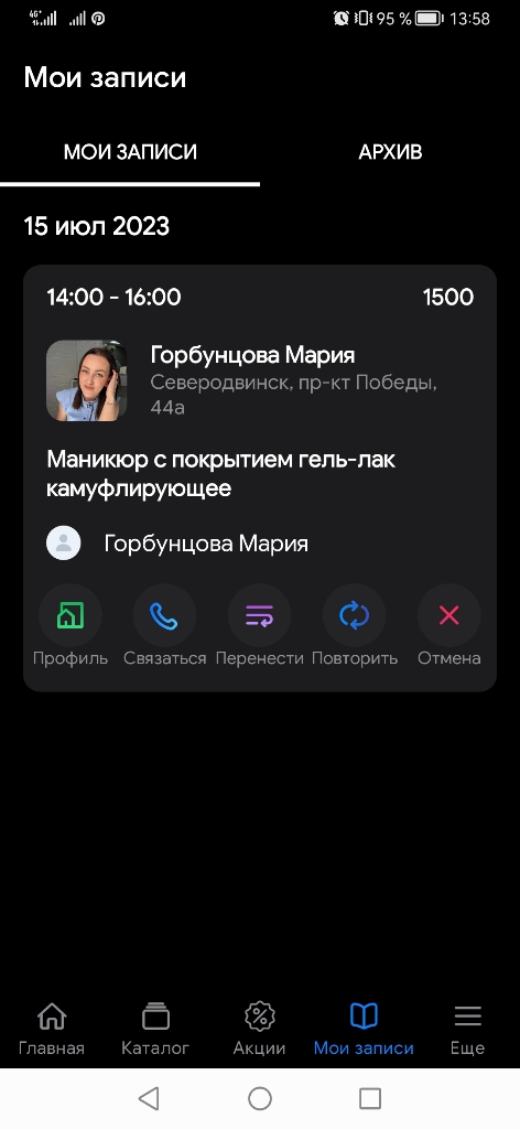 Записалась впервые к данному мастеру. Запись была сделана за 3 дня до визита. Пришло уведомление за сутки, что мастер ждет в назначенное время. За 45 минут до визита я написала в чат с мастером через DIKIDI для уточнения входа, этажа, кабинета. На что ответа не поступило. Приехав на место, звоню мастеру, а мастер не в курсе, что запись. Стала ссылаться на то, что приложение не отправило уведомление о записи. А то , что могут быть какие-либо сбои и можно зайти самой и проверить свои записи. Мастер конечно извинилась и предложила скидку на след. визит, но впечатление уже испорчено.
