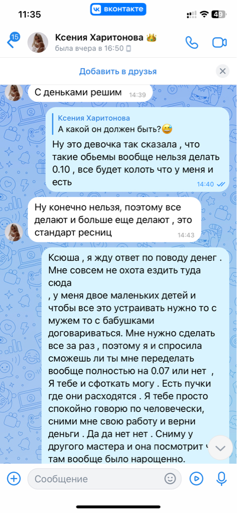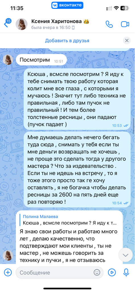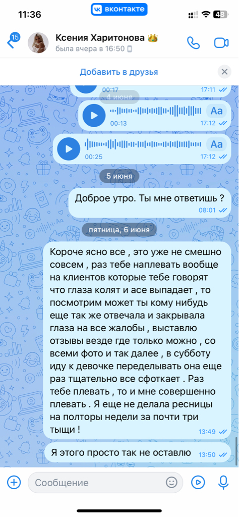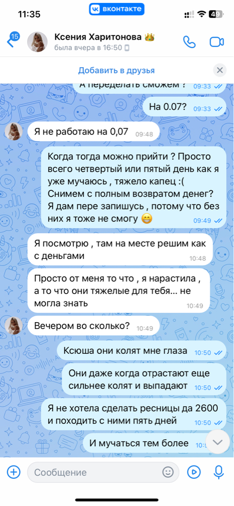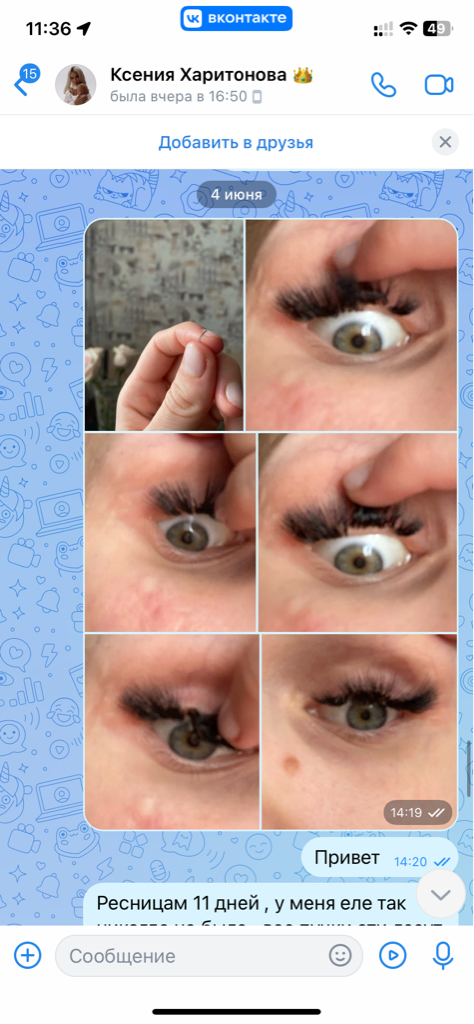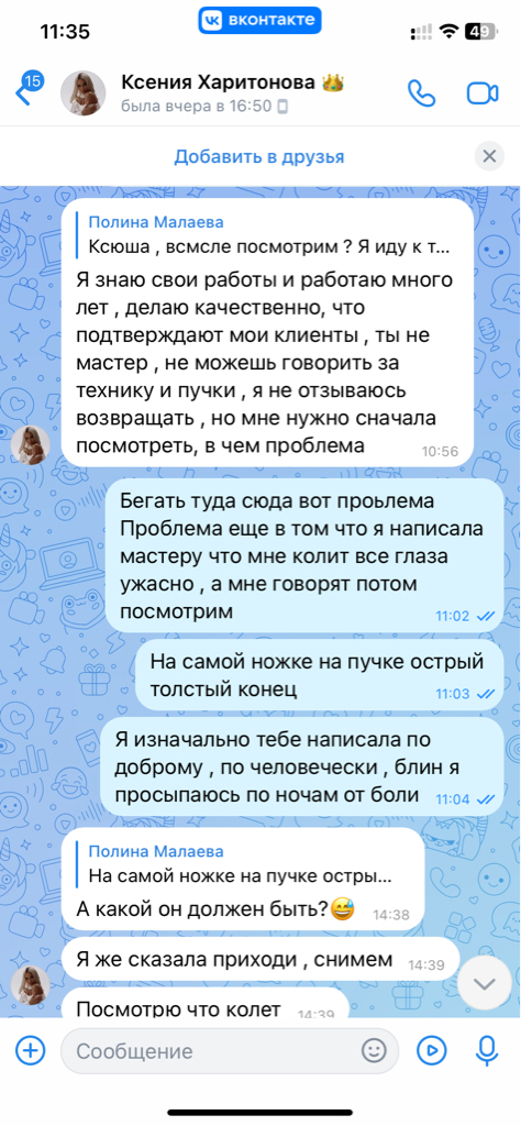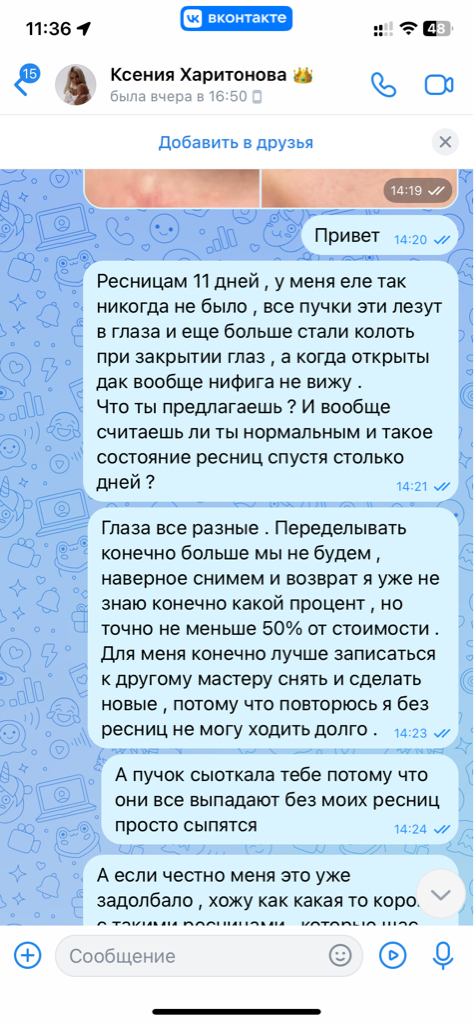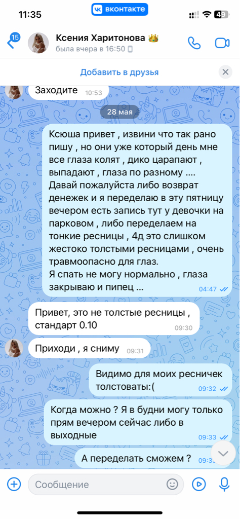 Спустя 4 дня прямо утром я написала Ксюше что у меня ужасно колит все глаза ! Тут писать большой отзыв нельзя , поэтому развернутый напишу в ЧЕРНЫЙ СПИСОК ПЕРМЬ И В ВЕРСУС .