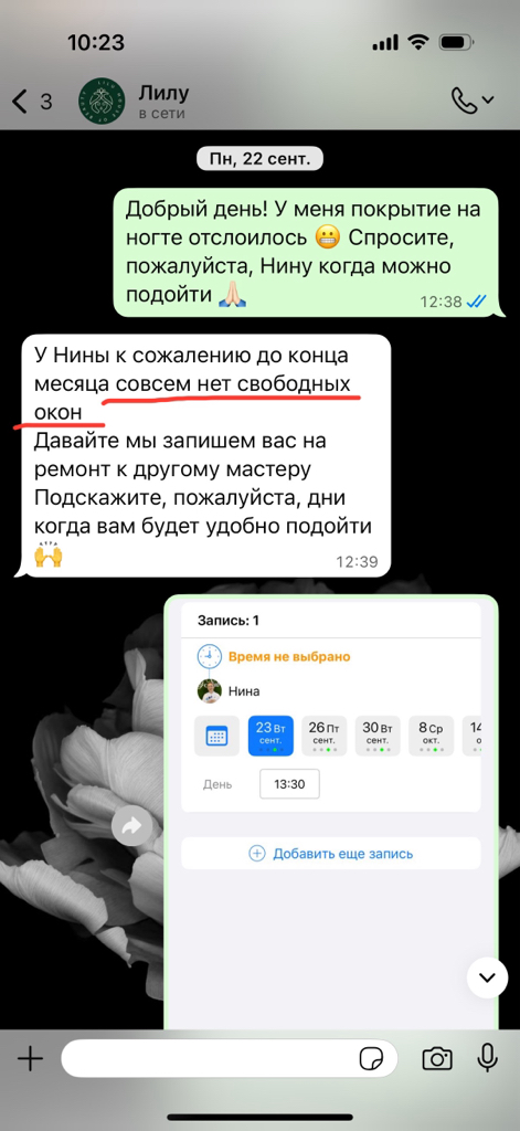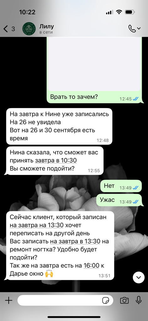 Была в Лилу на маникюре у Нины, через 6 дней отслоилось покрытие на ногте - это гарантийный случай. После предыдущего маникюра была такая же проблема - покрытие переделали. В этот раз, не желая переделывать - наврали, что у мастера нет мест до конца месяца. Зашла в DIKIDI- оказалось на 3 дня есть свободные окна. Ткнула носом и далее взаимодействовать, при таком ужасном отношении, желание пропало ⚠️