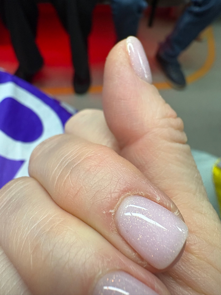 Через три дня кутикула в лохмотьях , фото прилагаю . Сама мастер и знаю , что это не норма и такого быть не должно. Скорее всего не заточены кусачки либо не дошлифовала фрезой. Красит неплохо. Делает быстро. Но своей цены услуга не стоит.