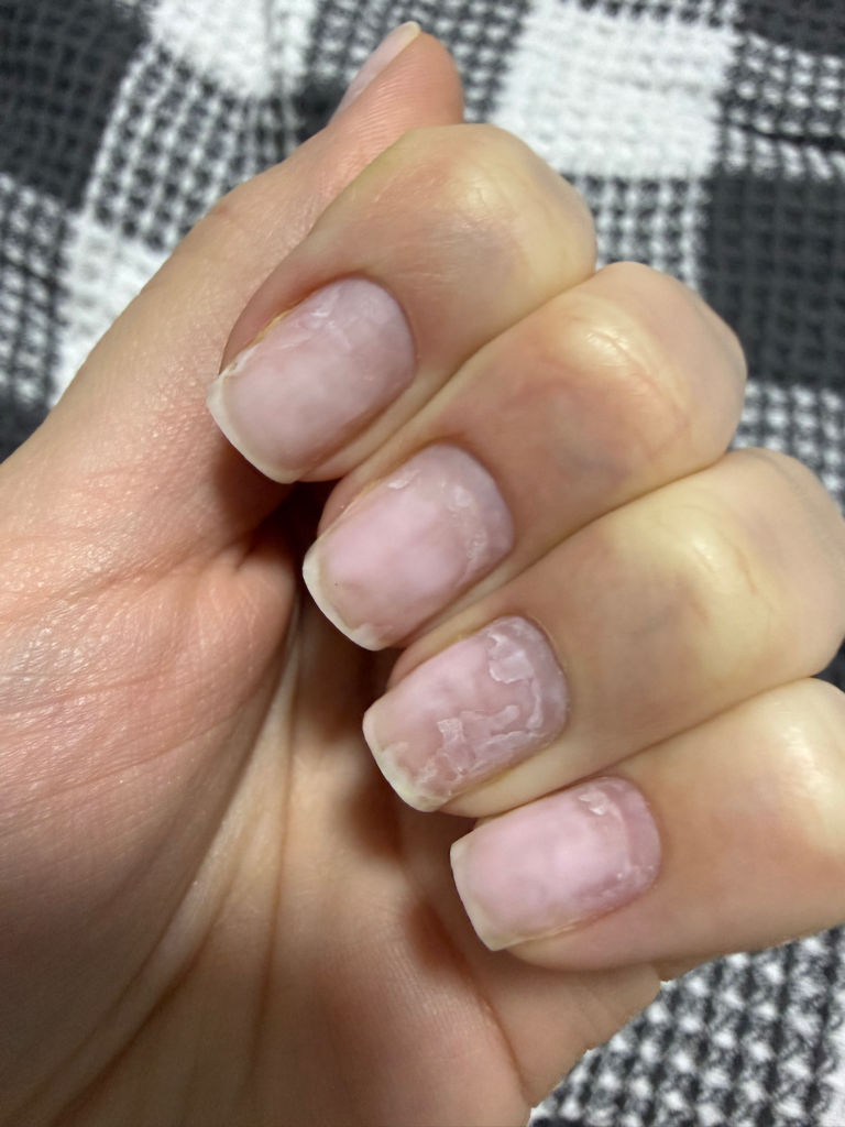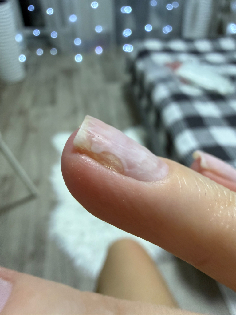 В таком состоянии ногти оказались за 3 месяца посещения данной студии. На фото - состояние ногтей, с оставленными на них кусками гель лака, мастер сообщил, что это сделано для того, чтобы ногти были не сильно тонкие. Расстройство с предстоящим долгосрочным восстановлением.